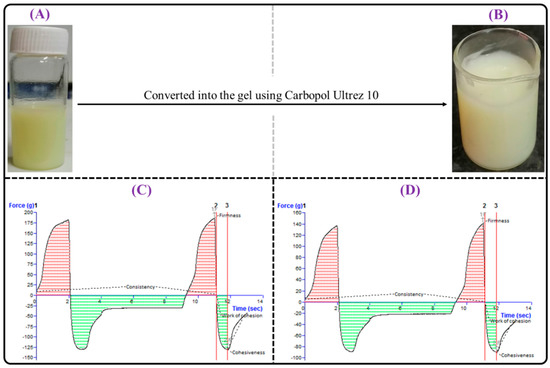 Image showing physical appearance of: (A) TAC-THQ-NLCs; and (B) TAC-THQ-NG. Representative texture analysis graph of (C) TAC-THQ-NG; and (D) TAC-THQ-SG showing firmness, consistency, cohesiveness, and work of cohesion.
