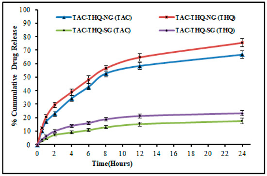 Comparative in vitro drug-release profiles of TAC and THQ from the optimized TAC-THQ-NG and TAC-THQ-SG.