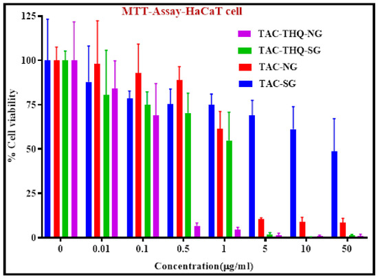 The antiproliferative activity of the TAC-THQ-NG, TAC-THQ-SG, TAC-NLC-gel (TAC-NG), and TAC-suspension-gel (TAC-SG) was evaluated in vitro using an MTT assay on the HaCaT cells (immortalized human epidermal cells). For this assay, 1 × 105 HaCaT cells per well were transferred for culturing into 96 well plates and placed in a CO2 incubator for 24 h. The culture media consisted of a DMEM medium containing fetal bovine serum (FBS; 10%) and antibiotic solution (Penicillin; 1%), and the temperature was maintained at 37 °C with CO2 (5%). Post incubation, various samples prepared at different concentrations (0.01–50 µg/mL) were added to the HaCaT cells and kept for incubation for 24 h. Subsequently, MTT dye at 250 µg/mL was mixed well and further subjected to incubation for 2 h. After that, the culture media were removed from each well, followed by the addition of 100 µL DMSO to solubilize the developed formazan crystals. Next, the plate was placed for 5 min on a shaker to solubilize the formazan crystals completely. Finally, absorbance at 570 nm wavelength was noted using a microplate reader (iMark, Biorad, USA). Cell viability was calculated from the absorbance data, and the results are reported as their corresponding IC50 values.