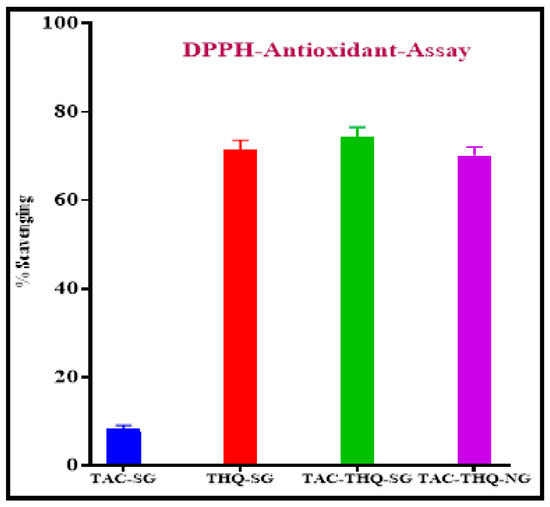 There is compelling evidence that free radicals, reactive oxygen species (ROS), the compromised function of antioxidants, and oxidative stress are responsible for the pathophysiology of psoriasis [42]. Therefore, the use of drugs having suitable antioxidant activity and retaining their antioxidant potential after encapsulation into the formulation is a prerequisite. Therefore THQ, an herbal drug having antioxidant potential, was used in combination with TAC. The percentages of the free radical scavenging activity of TAC-SG, THQ-SG, TAC-THQ-SG, and TAC-THQ-NG are depicted in Figure 13. Pure THQ showed 71.44 ± 2.17% free radical scavenging as compared to 74.31 ± 2.26% and 70.11 ± 1.97% for TAC-THQ-SG and TAC-THQ-NG, respectively. THQ showed strong antioxidant activity compared to pure TAC, which showed negligible free-radical-scavenging activity against DPPH. Additionally, THQ’s ability to scavenge free radicals was retained even after being combined with TAC in free form and after being encapsulated in the NLCs with TAC.