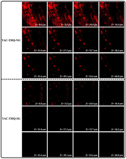 The skin distribution of the TAC-THQ-NG and TAC-THQ-SG was assessed using confocal laser microscopy. Figure 14 depicted the CLSM images of mice skin treated with TAC-THQ-NG and TAC-THQ-SG. As shown in Figure 14, it is clearly visible that TAC-THQ-SG could not penetrate deeper skin layers and was limited to a depth of 21.8 μm. As illustrated in Figure 14, the optimized formulation (TAC-THQ-NG) exhibited more significant penetration potential and fluoresced beyond 60 μm. Furthermore, it is evident from the fluorescence intensity of the CLSM image that the TAC-THQ-NG formulation was consistently dispersed throughout the viable layers of the skin, resulting in increased deposition of TAC and THQ between the epidermal and dermal layers of the skin, which are prone to psoriasis. Apart from this, Tween 80, used in the TAC-TAC-NG formulation as a surfactant, is a proven permeation enhancer; therefore, and aids in overcoming the SC, which prevents drugs from penetrating through the scaly psoriatic skin layer [43].