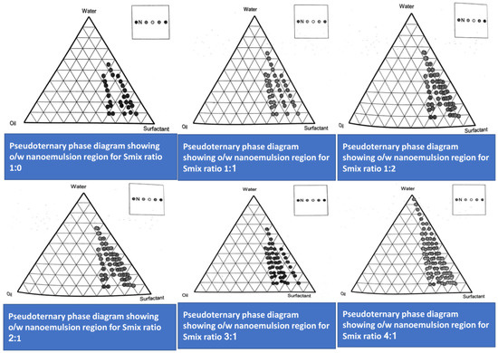Pseudoternary phase diagram showing o/w nanoemulsion regions for the Smix ratio (1:0, 1:1, 1:2, 2:1, 3:1, and 4:1).