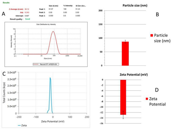 An appropriate zeta potential ensures that the nanoformulation system is intense and stable [27,28]. Nanoemulsions typically have a zeta potential value between +100 mV and −100 mV. Neutral nanoemulsions correspond to those with zeta potential values between −10 and +10 mV [29]. The developed nanoemulsion formulation showed a zeta potential value of −14.32 mv, indicating good stability (Figure 4).