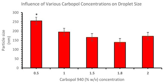 Influence of various Carbopol concentrations on droplet size. An asterisk (*) indicates that the value is significantly different at p < 0.05 compared to the other group.