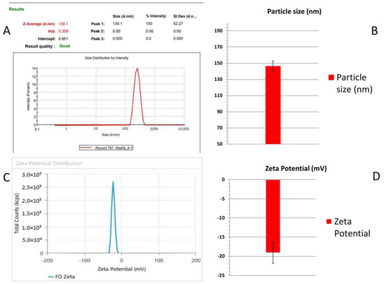 (A) Droplet size of developed nanoemulsion. (B) Bar diagram for droplet size of developed nanoemulsion. (C) Zeta potential of developed nanoemulsion. (D) Bar diagram for zeta potential of developed nanoemulsion.