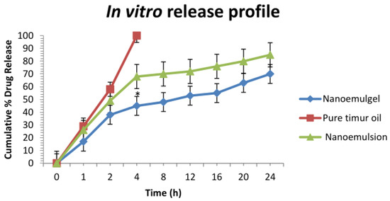 Comparison of in vitro release profile between pure Timur oil, nanoemulsion, and nanoemulgel. An asterisk (*) indicates that the value is significantly different at p < 0.05 compared to the other group.