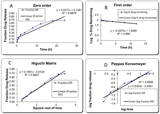 Various release kinetic models of the nanoemulgel: (A) zero-order kinetics; (B) first-order kinetics; (C) Higuchi matrix; (D) Korsmeyer–Peppas.
