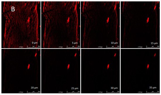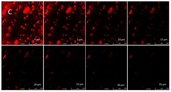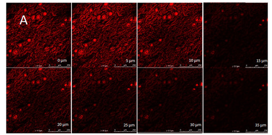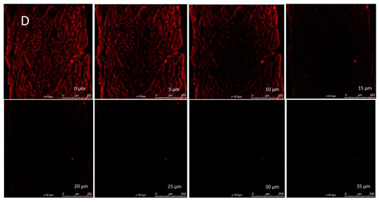 The CLSM investigation evaluated the depth and intensity of permeation through the skin of the rats treated with a marker-loaded commercial gel, the developed nanoemulsion, and the developed nanoemulgel. The outcomes were contrasted with those for the skin from the group that received the control treatment. The breadth and depth of the carrier system’s penetration into the skin were similar to the intensity and depth of the marker’s penetration. Figure 11A–D display the photomicrographs of rat skin treated with the control, commercial gel, developed nanoemulsion, and optimal nanoemulgel formulations. Compared to the control group, the treatment group treated with nanoemulgel-based formulations showed dramatically enhanced depth and intensity of penetration into the skin. This showed that formulations based on developed carriers have more potential for skin penetration.