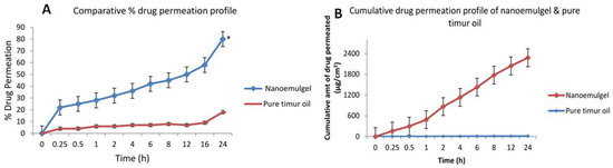 (A) Comparative % drug permeation profiles of the drug nanoemulgel and pure Timur oil. (B) Cumulative drug permeation profile of the nanoemulgel and pure Timur oil. An asterisk (*) indicates that the value is significantly different at p < 0.05 compared to the other group.