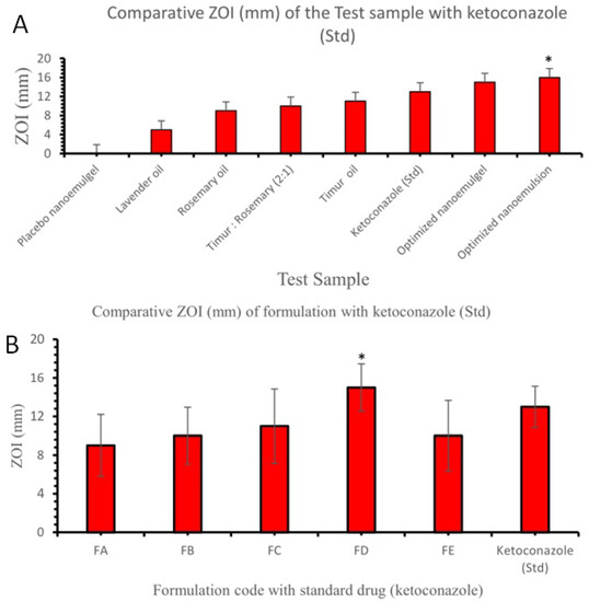 (A) Comparison of the ZOIs (mm) of the test samples with the ZOI of ketoconazole (Standard drug). (B) Comparison of the ZOI (mm) of the nanoemulgel formulation with that of ketoconazole (Standard drug). An asterisk (*) indicates that the value is significantly different at p < 0.05 compared to the other group.