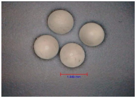The diameter of the carriers was measured to be 1.848 ± 0.116 mm during physical gelation (Figure 1) and 1.733 ± 0.107 mm during crosslinking with EDC. Notably, the diameter of the capsules decreased with longer coating times. Specifically, it measured 1.600 ± 0.086 mm, 1.497 ± 0.082 mm, and 1.345 ± 0.072 mm for coating times of 30, 45, and 60 min, respectively. To assess the strength of the carriers, a dynamometer was used to measure the force required to destroy them. It was observed that the physically gelled carriers exhibited significantly greater strength compared to the chemically gelled structures (Table 1). The observed differences in mechanical strength can be attributed to the distinct gelation mechanisms. During physical gelation, the formation of a three-dimensional network structure occurs, leading to stronger and more resilient carriers [17]. On the other hand, chemical gelation, facilitated by EDC cross-linking, may result in a less robust network structure, leading to decreased mechanical strength.