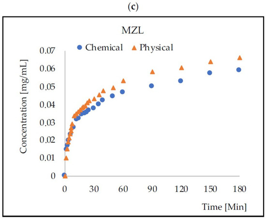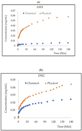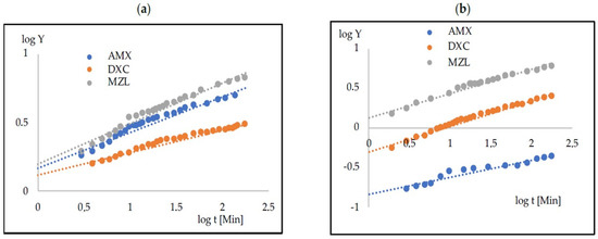 Fitting the experimental points to the Korsmeyer–Peppas model for the carriers that are physically (a) and chemically (b) gelled for AMX, DXC and MZL.