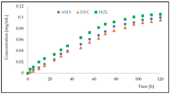 Change in AMX, DXC, and MZL concentrations over time at 37 °C (averaged values from three series) for HA–SAL carriers with PLA coating. Capsule volume to receiver solution volume was 1:9.47; capsules diameter was 1.345 ± 0.072 mm. The initial drug concentration inside the capsules was 1 mg/mL.