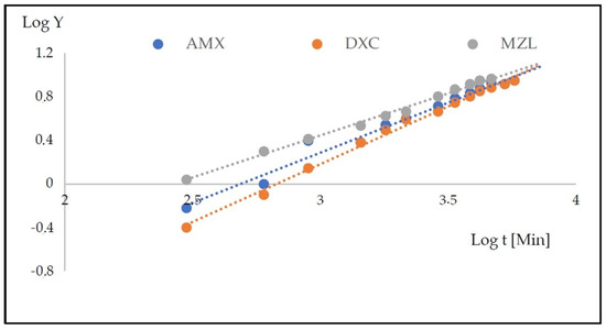 Fitting the experimental points to the Korsmeyer–Peppas model for the carriers with PLA coating for AMX, DXC and MZL.