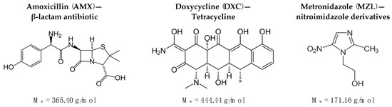 Sodium Alginate (SAL, M.w. 216 g/mol), Hyaluronic acid (HA, M.w. 8–15 kDa), Poly (D,L-lactide) (PLA, M.w. 75–120 kDa), N-(3-Dimethylaminopropyl)-N′-ethylcarbodiimide hydrochloride (EDC), Amoxicillin (AMX), Metronidazole (MZL), and Doxycycline (DXC) were provided by Sigma-Aldrich (St. Louis, MO, USA). The structures and molecular weights are presented in Figure 7.