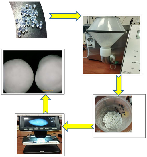 Tests were carried out with the coating of HA–SAL spherical structures (prepared by physical gelation) with polylactic (PLA) using a dry cover. PLA solution with a concentration of 2.5% w/v was prepared in methylene chloride. The process temperature was 45 °C. The solution was dosed at a speed of 4 RPM/min, air flow was 16 m/s, shaking at 21.2 hZ, and pressure at the nozzle of 0.5 bar. Capsule coating was carried out for 30–60 min.
