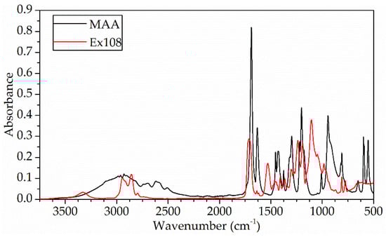 FTIR–ATR spectra of methacrylic acid (MAA) and oligomer Ex108.