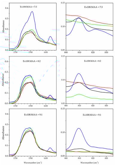 FTIR–ATR spectra were recorded for all tested compositions before and after photopolymerization to assess whether the (meth)acrylic groups reacted during the reaction. For this purpose, the heights of the absorption bands of the unsaturated C=C bond originating from both methacrylic acid and Ex108 were studied. Figure 2 shows the spectra in the range of occurrence in these vibrations, which are around 1630 cm−1 (together with bands of the C=O group) and 810 cm−1. As can be seen, the (meth)acrylic groups did not react at 100%, and the spectra absorption bands originating from the unsaturated C=C bond can be seen. The degree of conversion increases as the Ex108 content in the composition changes from 7:3 to 9:1. In addition, a higher concentration of the solvent causes a lower conversion (higher absorption of the bands) of the (meth)acrylic groups. Thus, the highest conversion is observed for composition Ex108:MAA 9:1 in 50% of the solvent, and the lowest conversion for composition Ex108:MAA 7:3 is observed in 70% of the solvent. Thus, a network with a higher density is obtained in the case of systems containing a higher concentration of Ex108 and a lower concentration of the solvent. This result may be related to the longer chain length of the oligomers, which means that they are able to react with each other in a dilute environment. The obtained results are related to the mechanical properties of the tested hydrogels.