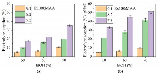 In cases of higher content of MAA in the polymer structure, the higher sorption of the electrolyte can be observed. Additionally, after neutralization, even further increasing of the electrolyte sorption can be seen. This phenomena can be explained based on increasing content of MAA in the hydrogel’s structure; therefore, decreasing crosslinking densities and increasing the hydrophilicity (based on the presence of carboxilic groups) of the polymer network. This outcome causes water sorption to increase to roughly 10–20% for Ex108:MAA = 8:2 and to roughly 20–35% for Ex108:MAA = 7:3, depending on the amount of EtOH used during the polymerization step. Additionally, neutralization of the electrolyte causes even further sorption, which increases up to roughly 20–40% and 30–50% for Ex108:MAA = 8:2 and Ex108:MAA = 7:3, respectively. These results clearly show that introduction of a hydrophilic monomer significantly influences electrolyte sorption, and because the MAA is an acidic monomer with the ability to cause hydrogen bond formation, the neutralization of the electrolyte allows us to further increase the sorption. Such a change in electrolyte sorption is typical for hydrogels containing acidic groups in their structure. As a result of the neutralization of these groups, the sorption of the electrolyte increases.