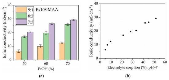 The ionic conductivity measurements were performed according to the methodology described in Section 4.2.5. The analysis of obtained results shows that both the mass fraction of the monomers and the EtOH amount obtained during polymerization had a significant impact on the ionic conductivity (Figure 4a). The ionic conductivity values increased with the increase in the content of the methacrylic acid in the hydrogel (at a constant value of the solvent used). The same relationship was observed when increasing the mass fraction of the solvent in the mixture (at a constant weight ratio of Ex108:MAA). Changing the composition of the photocurable mixture allows us to obtain the HPE with ionic conductivity in the range of roughly 6 mS∙cm−1 for the system containing 50% ethanol and with a weight fraction of Ex108:MAA of 9:1 and roughly 30 mS∙cm−1 for the system containing 70% ethanol with a weight fraction of Ex108:MAA of 7:3. Taking into account the ionic conductivity of the electrolyte (1 M Na2SO4), which was 80 mS∙cm−1, the relative conductivity values were obtained in the range of roughly 8–37%.
