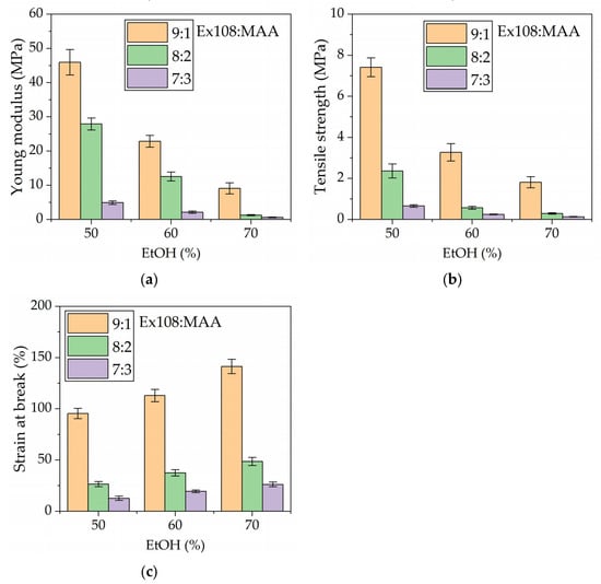 At the same time, it is shown in Figure 5c that the strain at break shows the highest values for hydrogels with the highest Ex108:MAA ratio (the range from roughly 95% to 140%), and the lowest values at the lowest Ex108:MAA ratio (the range from roughly 13% to 26%). Similar tendencies were obtained for Young’s modulus and tensile strength. However, the strain at break slightly increases with increasing EtOH content in the photocurable compositions, which is opposite behavior to that evidenced by Young’s modulus and tensile strength.