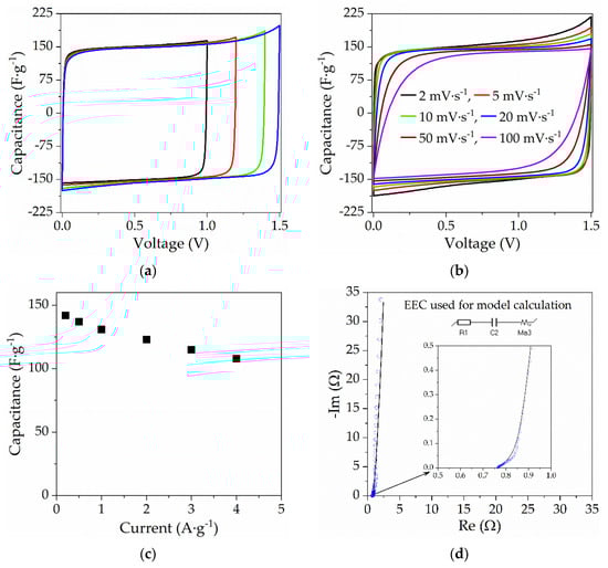 The CVs of the AC/AC electrochemical capacitor (Figure 6a) obtained at voltages up to 1.5 V were close to the perfect box-like shape. The absence of peaks on the CV curve proves the capacitive behavior of EDLC without redox reaction. As can be seen in Figure 6b, even increasing the scan rate to 100 mV∙s−1 causes only a slight deviation from the ideal box-like shape (maintaining 75% of the capacitance obtained at 2 mV∙s−1). In Figure 6c, dependence of the discharge capacitance on current is presented. Current changing from 0.2 A∙g−1 to 4 A∙g−1 caused a decrease in capacitance from roughly 140 F∙g−1 to 110 F∙g−1, which corresponds to a decrease of roughly 20% of its initial value.