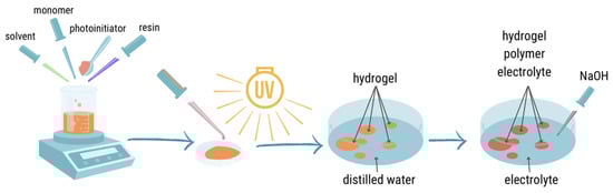 HPE can be synthesized via sorption of an aqueous electrolyte into a polymer matrix obtained using commercially available polymers, such as polyvinylpyrrolidone (PVP), potassium polyacrylate (PAAK) [], poly(vinyl alcohol) (PVA) [,,], and others [,,,,]. However, this method highly limits modification of the HPE structure. Therefore, polymerization of selected monomers seems to be the better option, because it allows for precise design of the final properties of synthesized HPEs. In particular, the use of photopolymerization to initiate the polymerization process seems to be the best method to obtain HPE. Photopolymerization has numerous advantageous features, such as excellent spatial and temporal controllability, as well as the fact that reaction occurs in room temperature without additional heating, meaning that energy demand is very low and the whole procedure is economical. This procedure only takes a few minutes, and there are no byproducts [,,,,].