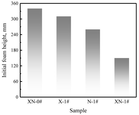 Figure 2 illustrates the initial foam height of the mixed dispersions. Adding 5% NPs and 0.05% XG to the FS-50/APG0810 dispersion reduces the initial foam height. The initial foam height of FS-50/APG0810/NPs/XG is dramatically decreased by adding XG to the FS-50/APG0810/NP dispersion. Notably, FS-50/APG0810/XG has a higher foaming ability than the FS-50/APG0810/NPs. The foaming ability of surfactant solutions is a complex process. It is influenced by various factors, such as surface tension, viscosity, conductivity, particle aggregation, and so forth. Prior research has demonstrated that an increase in viscosity hinders the creation of bubbles, resulting in a reduced foaming ability [26,27]. In the current study, an increase in dispersion viscosity was the primary cause contributing to the lower foam height.