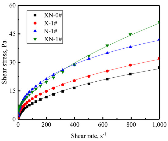 Figure 4 illustrates the variation curves of shear stress on the foam versus the shear rate. The shear stress on the four foams showed a nonlinear variation with the shear rate, indicating that the four foams exhibited the rheological behavior of non-Newtonian fluid. At the same shear rate, the shear stress on the foams with the presence of XG and/or NPs gradually increases, implying that the shear stress required to cause the deformation of foams stabilized using XG and/or NPs is greater than that of foams without them.