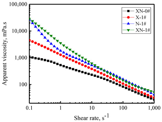 Figure 5 depicts the variation in apparent viscosity of the four foams over the shear rate. The apparent viscosity of the four foams reduces as the shear rate increases, further demonstrating that the four foams are non-Newtonian fluids with shear thinning behavior [35]. The reason for this behavior is that the bubbles and the aggregates formed by the foam components in the bubbles are destroyed by the shear force, caused by the gradually increasing shear rate, resulting in a reduction in foam viscosity [36]. For the foams without XG or NPs, the aggregates should be micelles formed by FS-50/APG0810 molecules. For the foams with XG, the aggregates should be micelles formed by FS-50/APG0810 molecules due to cross-linking and entanglement between the surfactant molecules and XG molecules [37]. For the foams with NPs, the aggregates should be created through the adsorption of FS-50 molecules and APG0810 molecules on the surface of NPs via hydrogen bonding and van der Waals forces. For the foams with XG and NPs, the aggregates should be created by FS-50 molecules, APG0810 molecules, XG molecules, and NPs (the silanol group on the surface of SiO2 NPs interacts with the carboxyl group (COOH) on the side chain of XG trisaccharide through hydrogen bonding [38]). With the inclusion of XG and/or NPs, the foam flow behaviors of the FS-50/APG0810 dispersions are unchanged, but the value of the foam’s apparent viscosity at the same shear rate significantly increases. This can be attributed to the fact that the incorporation of XG increases the viscosity of the dispersion, which in turn increases the apparent viscosity of the foam. In addition, the aggregates created by the FS-50 molecules, APG0810 molecules, and NPs stopped the shear process with the addition of NPs, resulting in the apparent viscosity being increased. These findings show that the shear rate necessary for a total breakdown of the foam structure gradually increases with the inclusion of XG and/or NPs. In comparison to the micelles generated by FS-50/APG0810 molecules and the aggregates created by surfactants and XG, the aggregates generated by surfactants and NPs show greater resistance to external damage and, to some extent, slow down the shear thinning process.