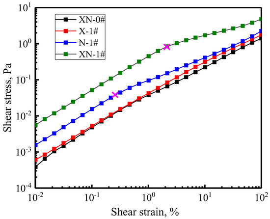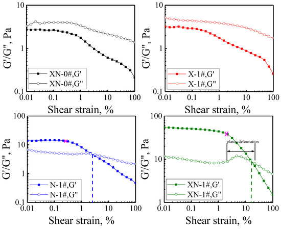 For XN-0# and X-1#, the viscoelastic response behavior remains viscous throughout the strain range due to G” > G’, further indicating that no yield point occurs on the curves of XN-0# and X-1# at the strain range of 0.01–100%. Notably, a point where G’ = G” appears in the modulus curves of XN-1# and N-1#, and the point is called a flow point [40]. The flow point reacts to the foam fluid changing from a gel-like solid to a fluid-like liquid [41,42]. The value of G’ is greater than that of G” before the flow point, where the viscoelastic response behavior is dominated by elasticity. However, the value of G’ is smaller than that of G” after the flow point, where the viscoelastic response behavior is dominated by viscidity. The values of shear strain corresponding to the flow points for N-1# and XN-1# are 3.18% and 14.8%, respectively. This result indicates that XG and NPs interact with one another to improve the foam viscoelasticity of FS-50/APG0810.
