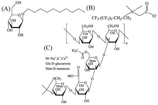Hydrophilic gas-phase SiO2 NPs (99.8 wt%) were acquired from Shanghai Aladdin Bio-Chemical Technology Co., Ltd. (Shanghai, China). Their average specific surface area was 300 m2/g. The nonionic hydrocarbon surfactant alkyl glucoside APG-0810 (50%), with the molecular structure as shown in Figure 8A (the rest of the ingredients were water and alcohols), was obtained from Shandong Yousuo Chemical Technology Co., Ltd. (Linyi, China). The C6 fluorocarbon surfactant with a zwitterion, Capstone® FS-50, was procured from DuPont; 27% of the FS-50 contained active components, and the others were water and a little ethanol. Its molecular structure, provided by the manufacturer, is shown in Figure 8B. Xanthan gum (XG), with the molecular structure shown in Figure 8C and a purity of 99.9%, was obtained from Tianjin Bailunsi Biotechnology Co., Ltd. (Tianjin, China).