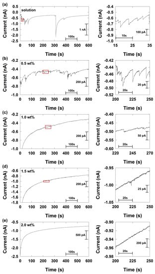 | Concentration of Agarose Hydrogel (wt%) | Experimental Current Magnitude (pA) | Noise Level a (pA) | Signal to Noise Ratio (S/N Ratio) |