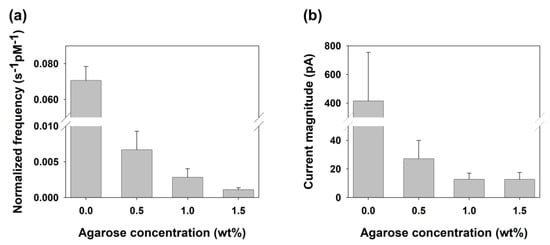 | Concentration of Agarose Hydrogel (wt%) | Calculated Current Magnitude a (pA) | Experimental Current Magnitude (pA) (±SD) | Calculated Frequency b (s−1) | Experimental Frequency (s−1) (±SD) | Normalized Frequency (s−1·pM−1) (±SD) |