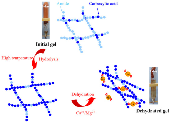 The above results indicate that the key to improving the long-term stability of polymer gels under HTHS conditions is to enhance their temperature and Ca2+/Mg2+ resistance. The Ca2+/Mg2+ ions mainly affect the stability of the gel because they attract the carboxylic acid groups (formed by the hydrolysis of the polymer) under electrostatic interaction. This interaction weakens the electrostatic repulsion among the carboxylic acid groups, and as a result, molecules of the polymer curl up and the gel dehydrates. In addition, the electric neutralization between Ca2+/Mg2+ ions and carboxylic acid groups also reduces the attraction of the latter to water molecules, leading to a reduction in the water-holding capacity of the polymer. At last, gel contraction and syneresis happen, as shown in Figure 2. At high temperature, the HPAM is further hydrolyzed to form a large number of carboxylic acid groups which have significant electrostatic attraction with the divalent cations and result in the expulsion of water.