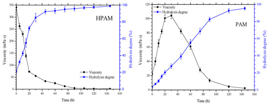 Variation of the viscosity and degree of hydrolysis of HAPM and PAM as they age.
