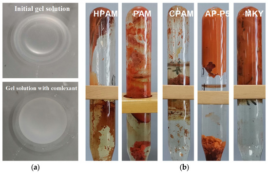 To investigate the adaptability of complexant-stabilized polymer gels to ultra-high-saline conditions (TDS: 22.5 × 104 mg/L, Ca2+/Mg2+: 10,872 mg/L), five different types of polymer gels were prepared and maintained at 125 °C for stability evaluation. In each case, 0.8% polymer (HPAM, PAM, CPAM, AP-P4, and MKY) was used in combination with 0.3% urotropine, 0.3% resorcinol, and 0.4% sodium oxalate (Figure 5).