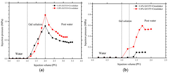 The SAV-based gels are much weaker (Table 5) than the polymer gels based on the conventional polymers HPAM, CPAM, AP-P5, and MKY (Table 2 and Table 4). This is because the SAV10 and SAV55 polymers have small molecules and contain a large number of AMPS groups, which reduce the number of amide groups capable of crosslinking with the phenolic system. We therefore needed to determine whether or not these low-strength gels can effectively plug the pores in oil-bearing media. Thus, plugging experiments were performed using the SAV10 and SAV55 gels and cores with permeabilities of 1000 and 5000 mD. The results obtained are shown in Figure 6.