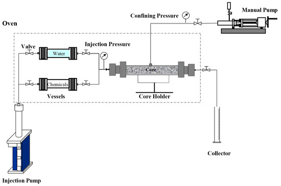 Two high pressure vessels were employed to store the experimental fluids (water and chemicals–polymer gel solution). An automatic pump was connected to the vessels to inject the fluids into the core holder within which the core was placed (oriented horizontally) to simulate a porous media such as a reservoir. A manual pump was employed to apply a confining pressure to the core holder (maintained at 3.0 MPa above the pressure inside) to avoid the bypassing of the injected fluids from the side of the core. At the end of the process, a collector was used to gather the liquids produced. All experimental pressures were measured using pressure gauges connected to the system. The oven was used to heat the vessels and core holder to the desired experimental temperature (125 °C).