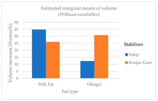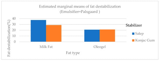 Fat destabilization ratios of ice cream samples ranged from 18.71 to 37.50% (Table 3). The fat destabilization ratios of samples containing oleogel and konjac gum were lower than those of samples containing milk fat and salep (Figure 4). The fat destabilization ratio of samples with PG as an emulsifier (C, F, I, and L samples) was statistically higher (p < 0.01) than those of samples with MG and samples with no emulsifier (NE). Amador et al. [] made ice cream using an emulsifier at different ratios and found that fat destabilization values were between 6.6% and 36.0%, consistent with the findings of this study. In another study, Ozdemir et al. [] discovered that the fat destabilization ratios of ice cream samples with different sweeteners ranged between 14.62 and 42.40%, which was consistent with the findings of this study.