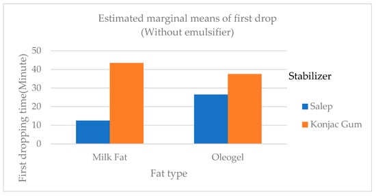 Guven et al. [] produced Kahramanmaraş-style ice cream using only salep, locust bean gum (LBG), CMC, guar gum, and S. alginate combinations and discovered that samples containing only salep dropped the earliest, which corresponded to the findings of this study. Another study looked into the possibility of using konjac gum as an alternative to salep, which is commonly used in ice cream production. As a result, it was determined that it can be used alone or in combination with salep to make ice cream. The melting time of samples containing salep was shorter than that of samples containing other stabilizer combinations []. The G sample (salep as a stabilizer, milk fat without emulsifier) took the longest time to completely melt.