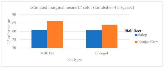 While the L value expresses brightness in daylight (black and white), the a* value represents green-red color, and the b* value represents blue-yellow. Consumers mostly prefer white in plain ice cream. The L* color scores, which indicate the white color level of ice cream samples, ranged from 80.66 to 87.15. The addition of oleogel to the ice cream mix did not affect the L* color value of the ice cream mix. The differences in L* values between samples with different emulsifiers were not statistically significant (p < 0.01). However, the addition of oleogel and salep reduced the L* color value (Figure 5). In research by Ozdemir et al. [], it was found that the whiteness value (L*) of the ice cream samples ranged from 82.02 to 85.51, which was consistent with this study. In another study, Corradini et al. [] discovered that the L* color value for ice cream samples containing palm oil and coconut fat ranged between 57.7 and 64.5 [] and detected lower L* color values than this study.