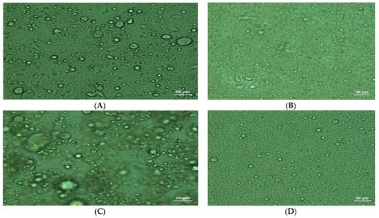 In the microscopic appearance of samples of oleogel-added ice cream, while the oil and water particles were not dispersed as homogeneously (Figure 10A,C) as in the samples of milk fat-added ice cream, components were dispersed very homogenously (Figure 10B,D). The fat destabilization ratios of the samples of oleogel-added ice cream were lower than those of the samples containing milk fat (Figure 4), consistent with their microscopic appearance.