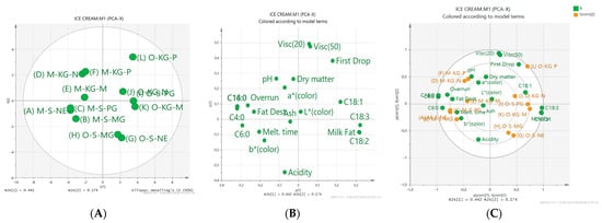 Score scatter plot (A), loading scatter plot (B), and biplot (C) of PCA analysis (PC1 versus PC2) for the components of the ice cream.