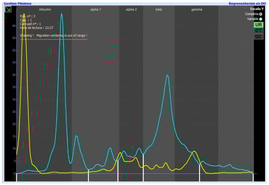 Although quantitative proteinuria can only be assessed by the urine protein:creatinine (UPC) ratio, urine electrophoresis can be used as a semi-quantitative method and provides different patterns that can be related to health or renal and extrarenal diseases [16,17,18,25,26]. In UCE, the proteins in each fraction cannot be identified by their molecular weight as in gel electrophoresis, which may be a disadvantage in evaluating glomerular or tubular proteinuria [4]. The combination of the UCE technique with mass spectrophotometry or immunofixation could assess which proteins are excreted in each fraction of the urinary electrophoretogram so that these proteins could be used as urinary biomarkers for the diagnosis and monitoring of different pathologies [25].