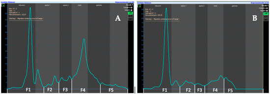 The electrophoretic urine pattern obtained for each cat was divided into five protein fractions: F1 or albumin; F2 or alpha1-globulin; F3 or alpha2-globulin; F3 or beta-globulin; and F5 or gamma-globulin. After the division, the percentage of each fraction was obtained. These fractions were determined according to a diluted serum from a healthy cat superposed on every urine sample (Figure 1). Although the fractions do not migrate at the same point, they can be used as a guide, as the different fractions have similar characteristics. In some studies, albumin in urine tends to migrate near the anode compared to serum in CE, which could be the reason why in urine, albumin migrates later than in serum (Figure 1) [27,28].