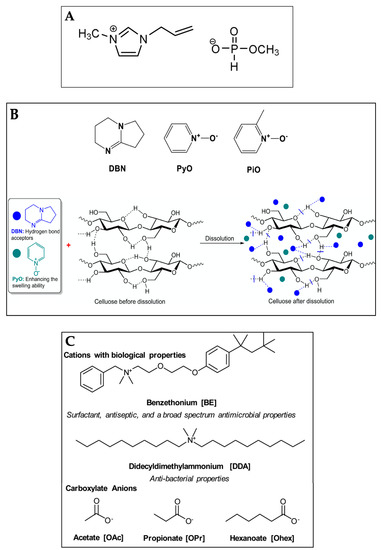 Chemical structures of 1-allyl-3-methylimidazolium methyl phosphonate (Amim (MeO)PHO2) (A) (Reprinted with permission from ref. [76] Copyright © 2019, Elsevier, B.V.), 1,5-diazabicyclo [4.3.0] non-5-ene (DBN), pyridine N-oxide (PyO) and 2-picoline N-oxide (PiO) with graphic dissolution mechanism of cellulose (B) (Reprinted with permission from ref. [82] Copyright © 2021, Elsevier, B.V.), and benzethonium (BE)- and didecyldimethylammonium (DDA)-based ILs combined with short alkyl carboxylate anions (C) (Reprinted with permission from ref. [83] Copyright © 2021, Royal Society of Chemistry).