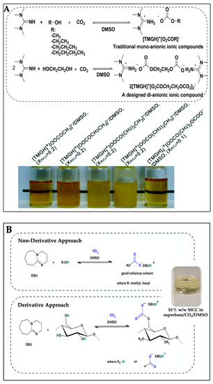 In designing a new IL solvent system for cellulose dissolution, reversible/switchable reactions with CO2, a well-recognized greenhouse gas, have been extended [100,101,102]. Xie et al. [100] reported that the CO2-based reversible IL/DMSO solvent could dissolve MCC up to 10% w/w under mild conditions at 60 °C and a CO2 pressure of 2.0 MPa for 2 h, when 1,1,3,3-tetramethyl guanidine (TMG) was used as a base, in conjunction with methanol, ethanol, propanol, butanol, and ethylene glycol (Figure 2A). Yang et al. [103] also reported that DBU/DMSO could promote the dissolution of cellulose pulp at the relative low temperature of 50 °C in the presence of CO2. This is because the addition of CO2 causes the reversibility or switch-ability of this solvent system by changing the polarity from nonpolar to polar and reversing to its initial nonpolar state upon the release of CO2 [104,105]. Cellulose dissolves in this solvent system by nonderivative and derivative approaches (Figure 2B). In the nonderivative approach, simple alcohols such as methanol, hexanol, or ethylene glycol, in the presence of strong organic bases such as DBU, react with CO2 leading to the formation a DMSO–carbonate species solvent that can solubilize cellulose [100]. In the derivative approach, the superbase activates cellulose first and, thereafter, reacts with CO2 to form a DMSO-soluble cellulose carbonate intermediate [106].