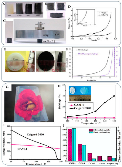 Appearance and properties of cellulose hydrogels prepared by using ILs, e.g., 1-buthyl-3-methyl imidazolium chloride (BmimCl) and 1-allyl-3-methyl imidazolium chloride (AmimCl), and an addition of graphene oxide (A–D), polypyrrole (PPy) (E,F), and liquid electrolyte (G–J). Images of composite cellulose hydrogels containing 5% w/w of cellulose and 0, 0.1, 1, and 10% w/w of graphene oxide before (A) and after (B) freeze-drying. The freeze-dried composite hydrogel supporting a counterpoise (C). Compressive stress–strain curves of the cellulose hydrogels containing 0 and 0.5% w/w of graphene oxide (D). (Reprinted with permission from ref. [160] Copyright © 2015, Elsevier, B.V.). Images (E) and compressive stress–strain curves (F) of the cellulose hydrogels containing 2.5% w/w of MCC and PPy. (Reprinted with permission from ref. [164] Copyright © 2014, Elsevier, B.V.). Image (G) and thermal properties (H,I) of cellulose hydrogel containing 4% w/w of cellulose (CAM-4). Electrolyte uptake and ionic conductivity of cellulose hydrogels containing 2–10% w/w of cellulose compared with those of Celgard 2400 commercial separator (J). (Reprinted with permission from ref. [165] Copyright © 2017, American Chemical Society).