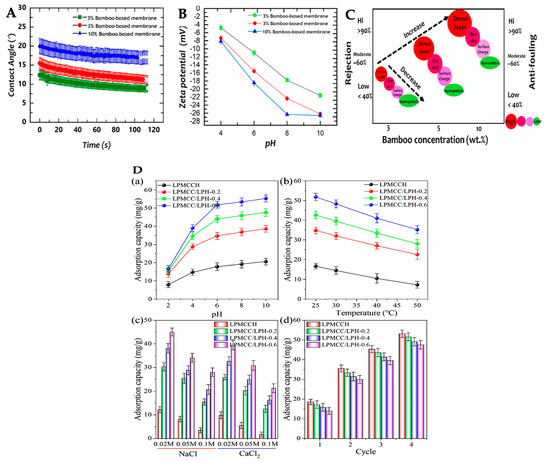 Properties and efficiencies cellulose membranes prepared by dissolving bamboo cellulose (A–C) and lemon peel cellulose mixed with raw lemon peel (D) in 1-buthyl-3-methyl imidazolium chloride (BmimCl) as the casting solution. Dynamic contact angle (A), zeta potential (B), and effectiveness (C) of membranes prepared from bamboo cellulose at the concentration of 3, 5, and 10% w/w. (Reprinted with permission from ref. [191] Copyright © 2020, American Chemical Society). Adsorption capacity of cellulose hydrogel (D) prepared by dissolving lemon peel cellulose without mixing raw lemon peel (LPMCCH) and with mixing the lemon peel of 0.2–0.6 g (LPMCC/LPH). Effects of pH (a), temperature (b), ionic type and strength (c), and adsorption/desorption cycles (d). (Reprinted with permission from ref. [192] Copyright © 2021, Elsevier, B.V.).